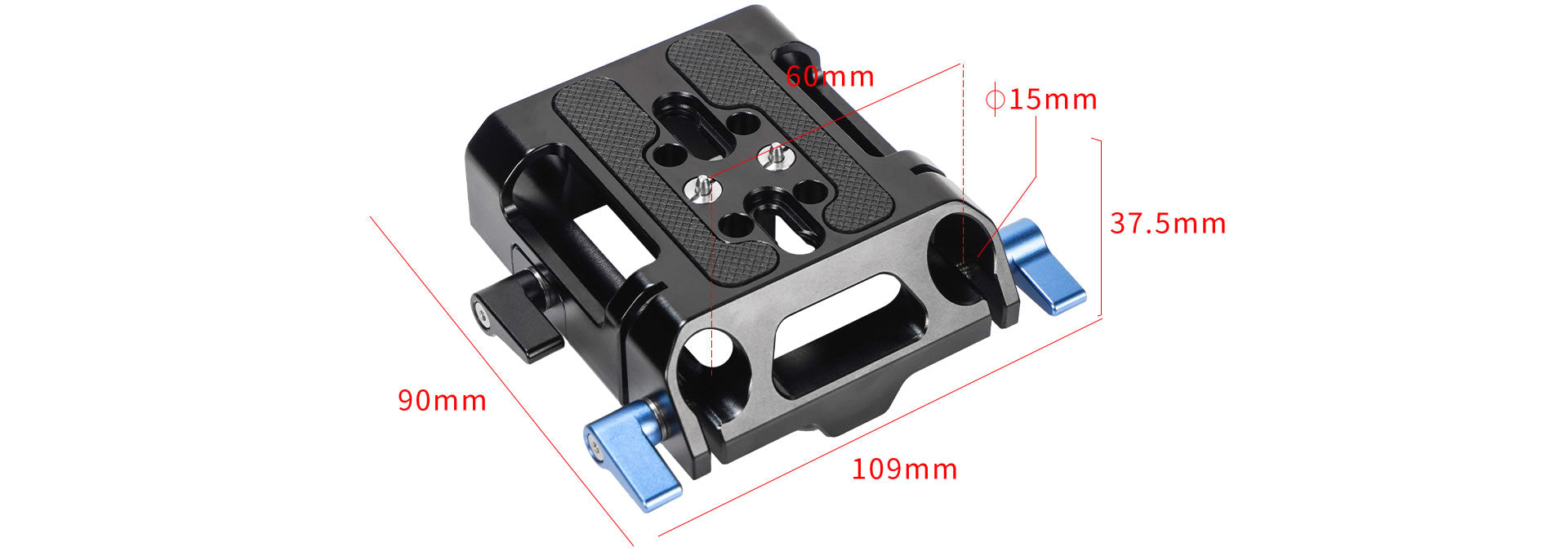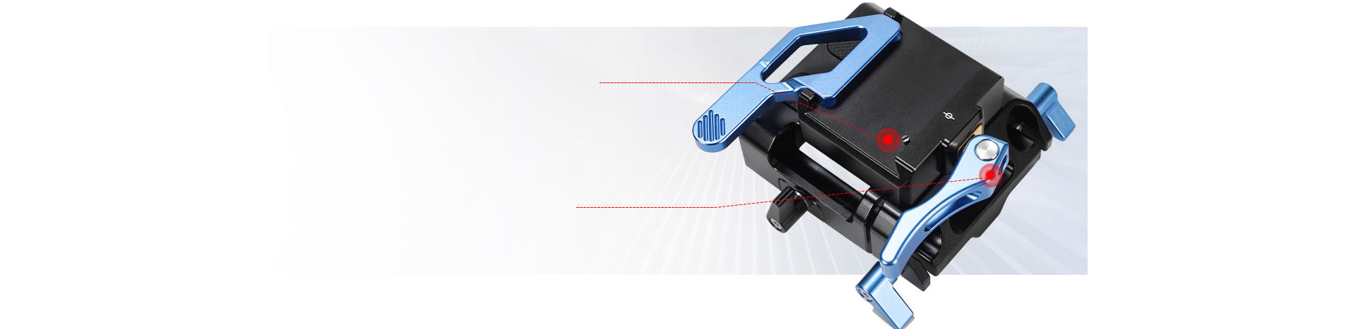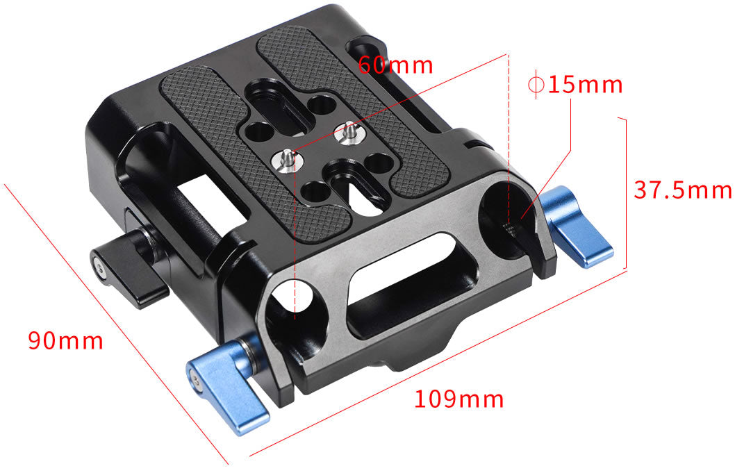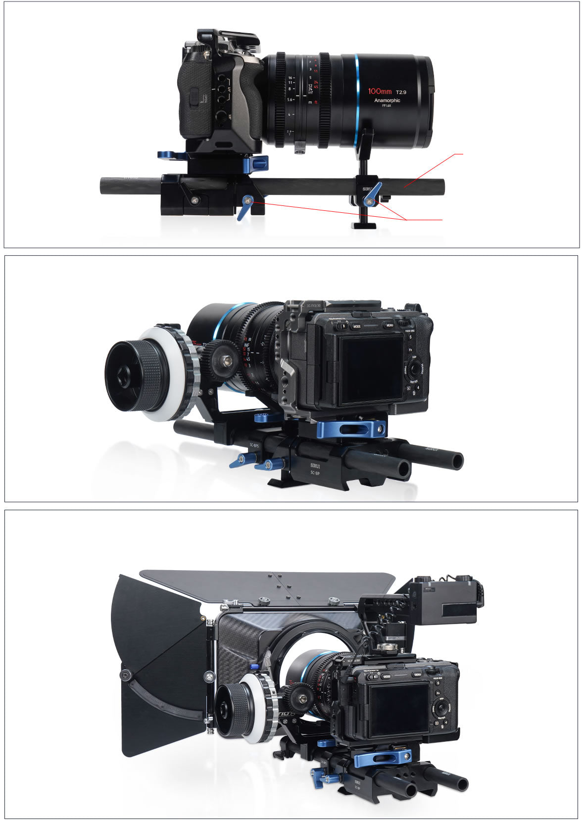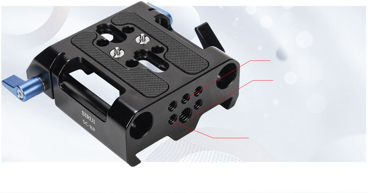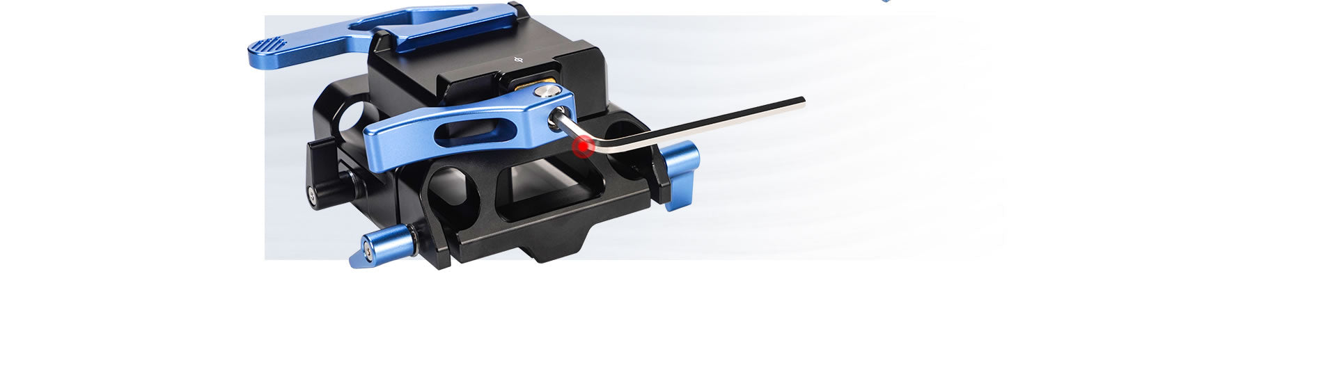 Follow focus, lens support, matte box, V-mount battery plate and other accessories can be added to the baseplate via 15mm rods. And you can adjust the accessories back and forth via two locking knobs.