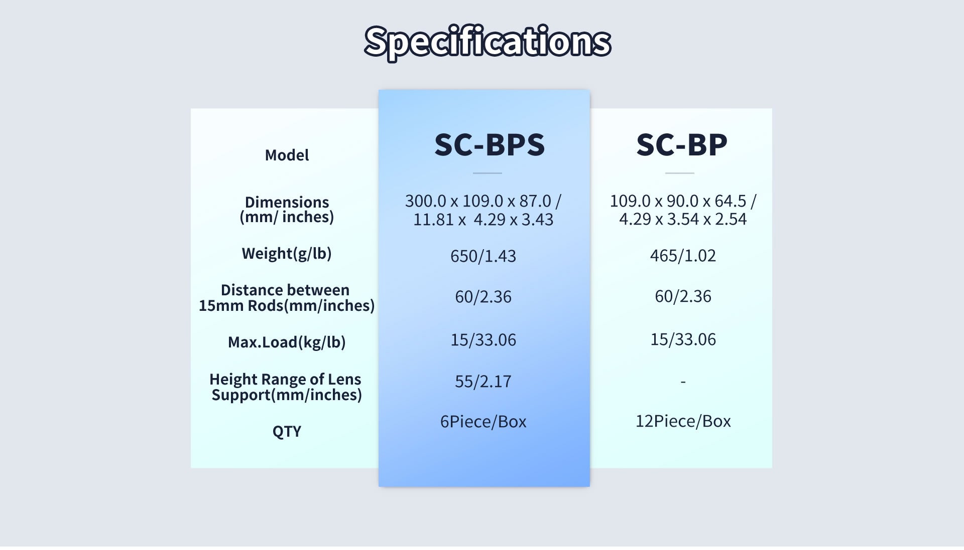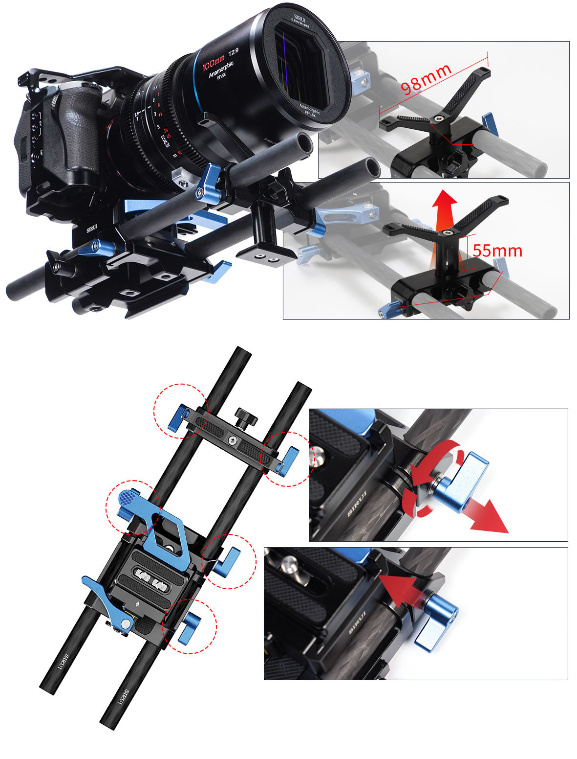 The Y-shaped lens support helps carry the weight of lens with a diameter from 50 to 140mm. You can adjust the height within a range of 55mm via the quick release knob. And it is compatible with 15mm dual rod clamp. Built-in rubber pads helps protect your camera.