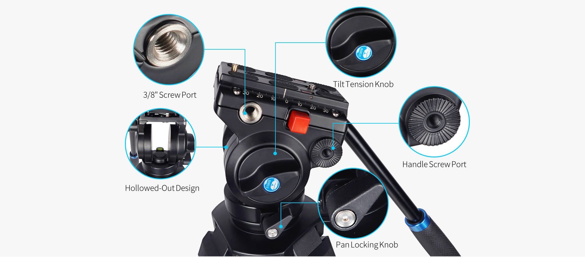 The video head is mounted on the tripod via a bowl of 60mm in diameter. If you want to leveling the shooting angle, just turn the handle at the bottom of the video head without adjusting the tripod. The video head features a hollowed-out design that further reduces the weight of itself. Accessories with multiple specs can be attached to the head via the 3/8" screw port.