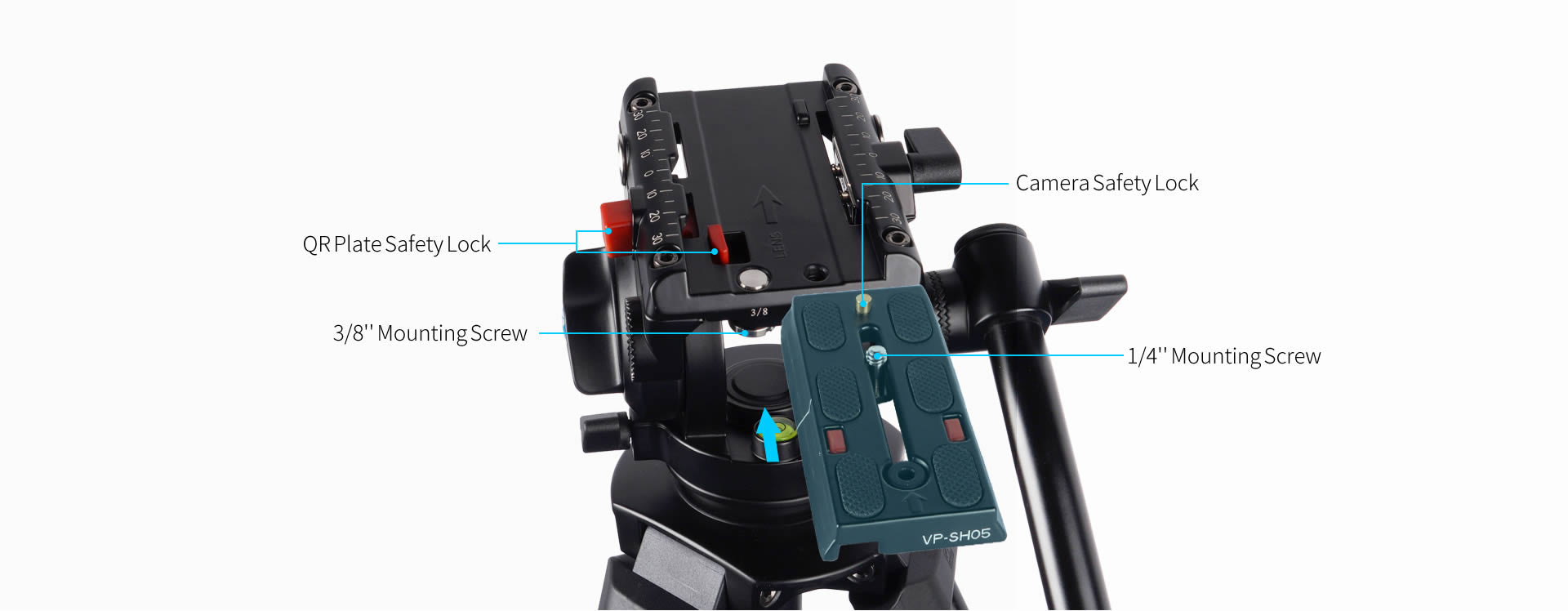 The versatile QR plate is equipped with two safety locks to prevent the gear from accidentally falling. You can mount useful accessories on the video head via the 1/4'' and 3/8'' mounting screws.
