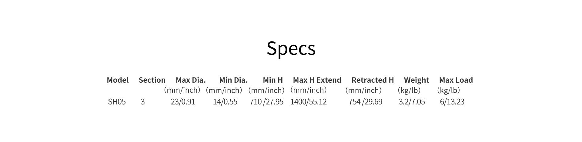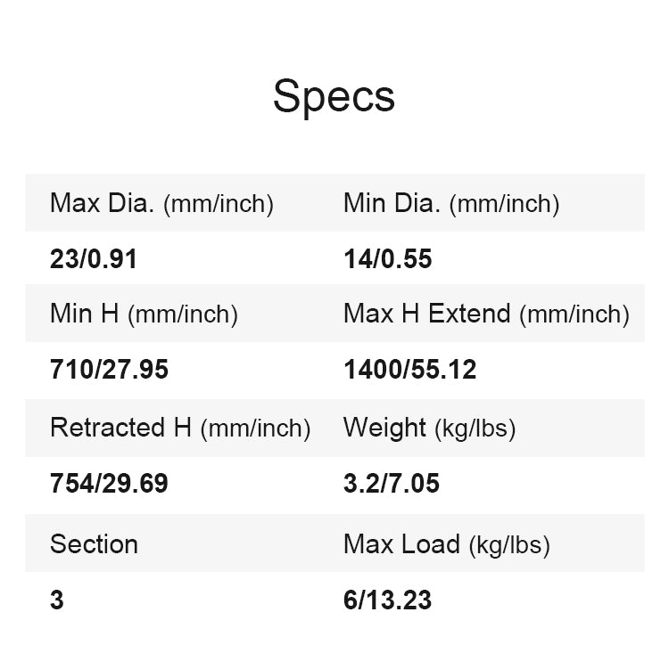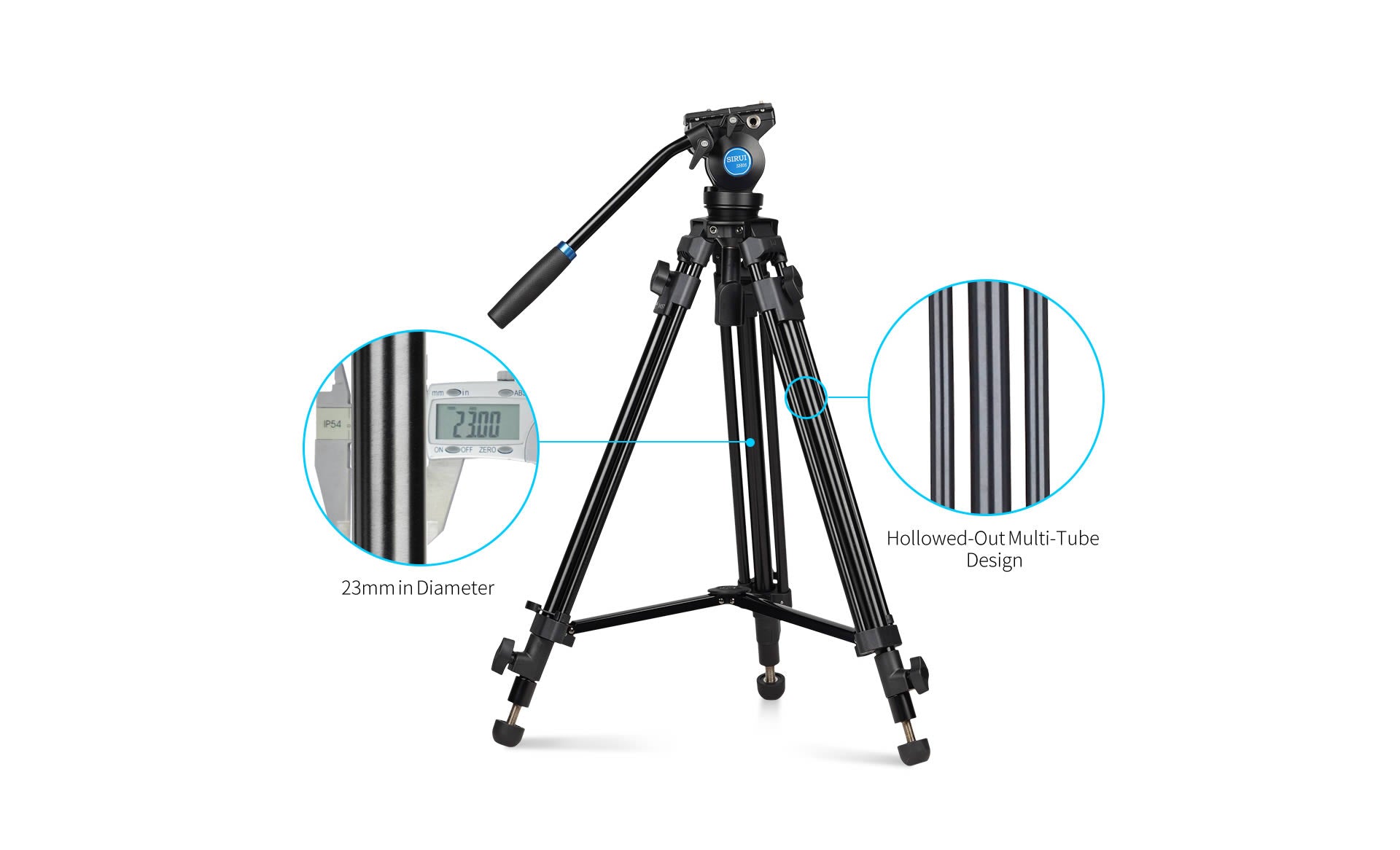 The hollowed-out multi-tube design greatly reduces the weight of the tripod itself, allowing you to carry the tripod around effortlessly when shooting outdoors. The diameter of the middle leg tube is increased up to 23mm to ensure that the tripod is of good stability even when fully opened.