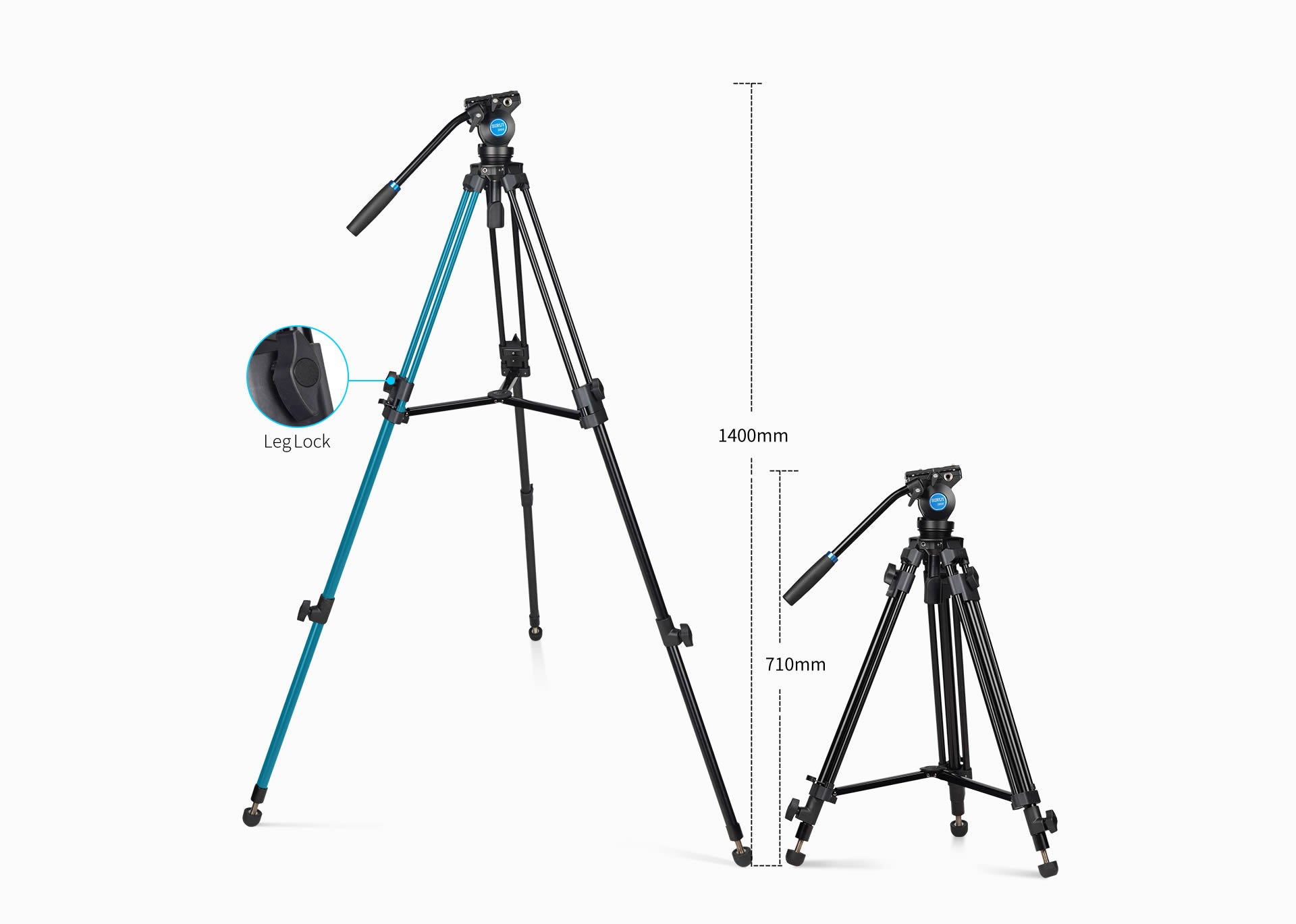 The tripod is comprised of three sections. Loosen the leg locks and lift them up and down to desired heights (from 710mm/27.95inches to 1400mm/55.12inches) according to your shooting purposes.