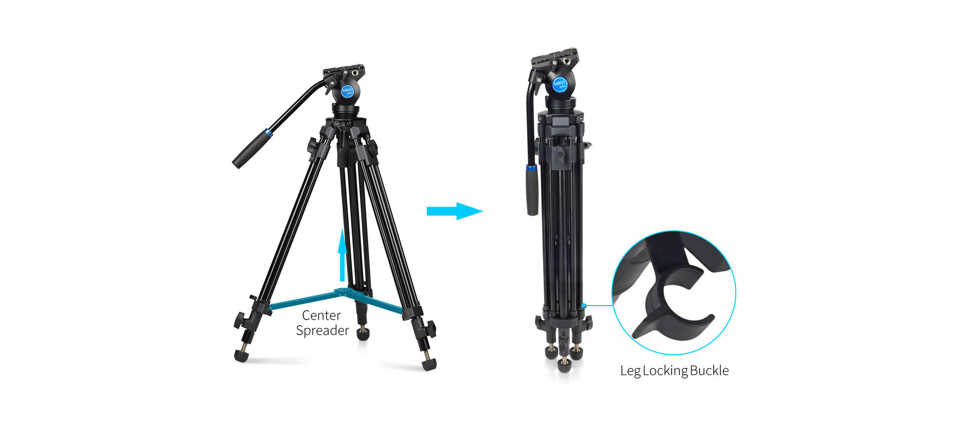 The center spreader can be individually adjusted in width to give the tripod necessary stability. Lift the spreader up to quickly collapse the tripod. The leg locking buckles are attached to prevent the leg tubes from easily opening up.