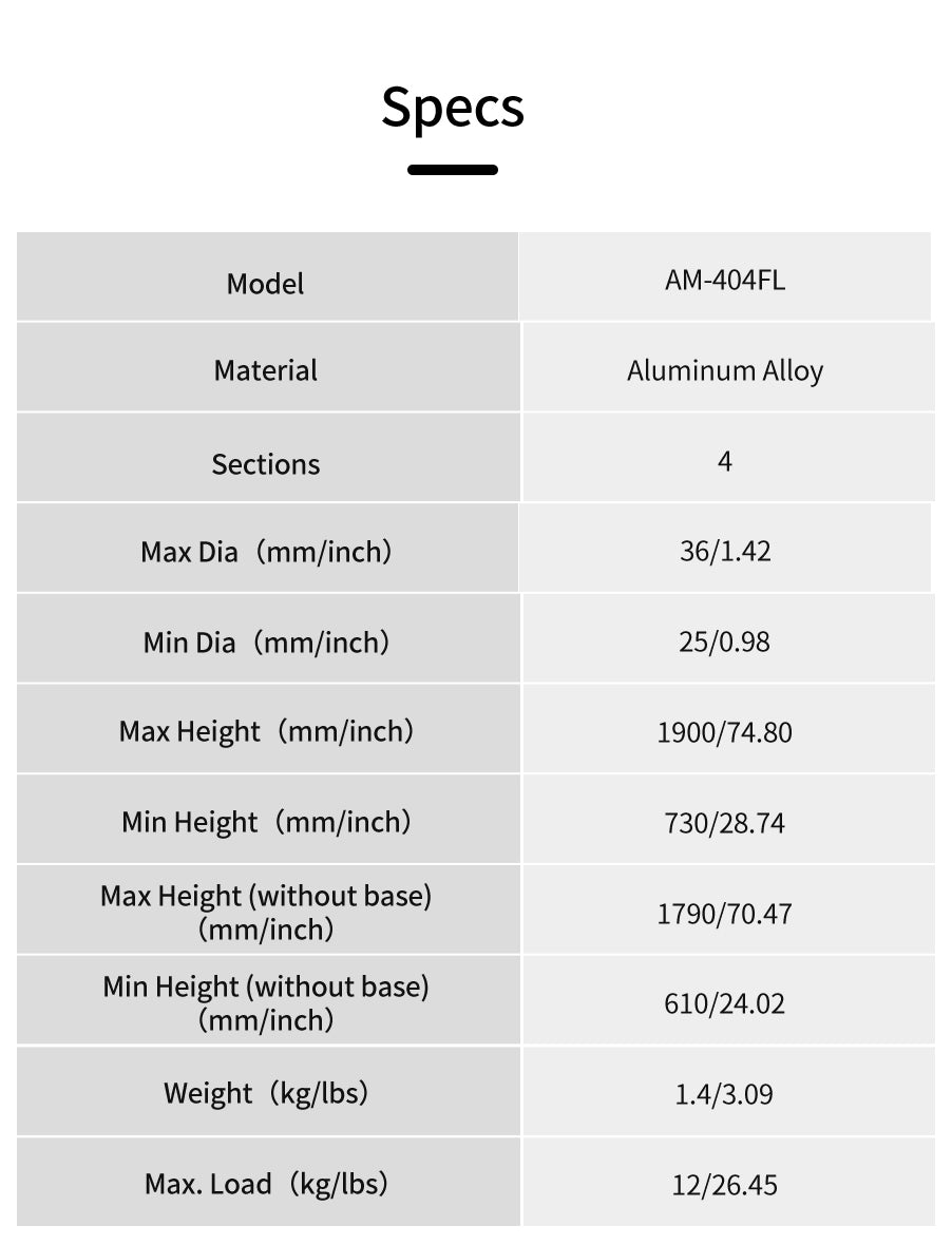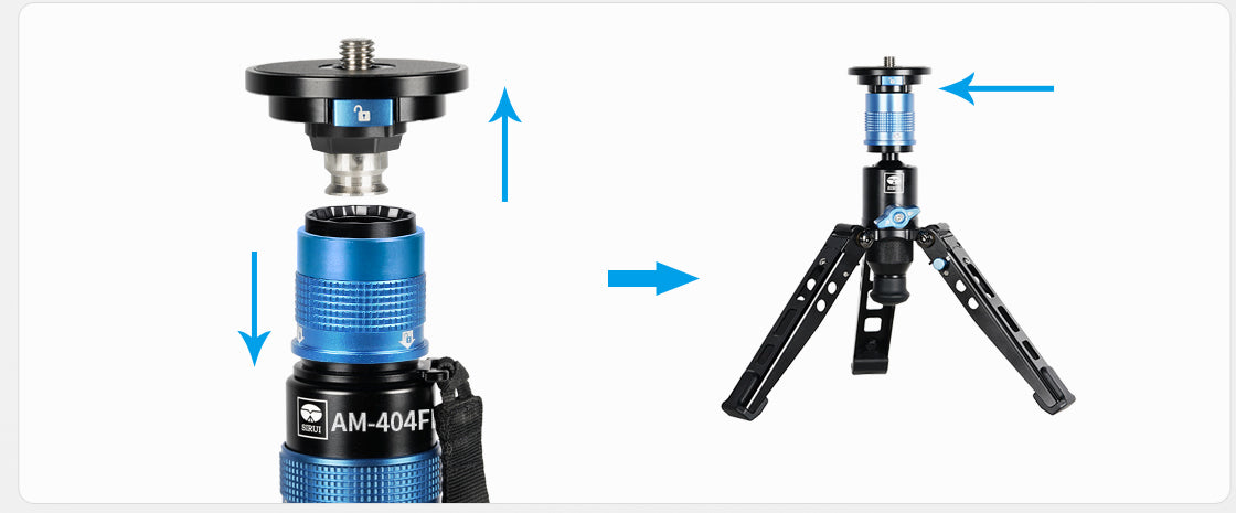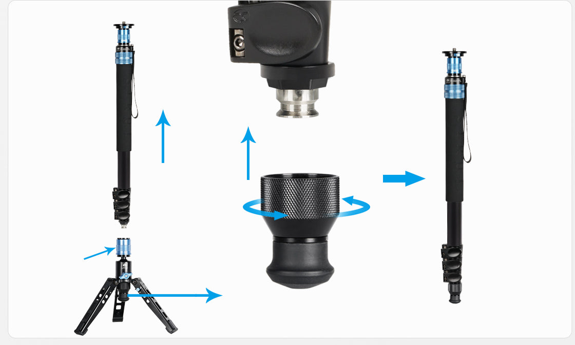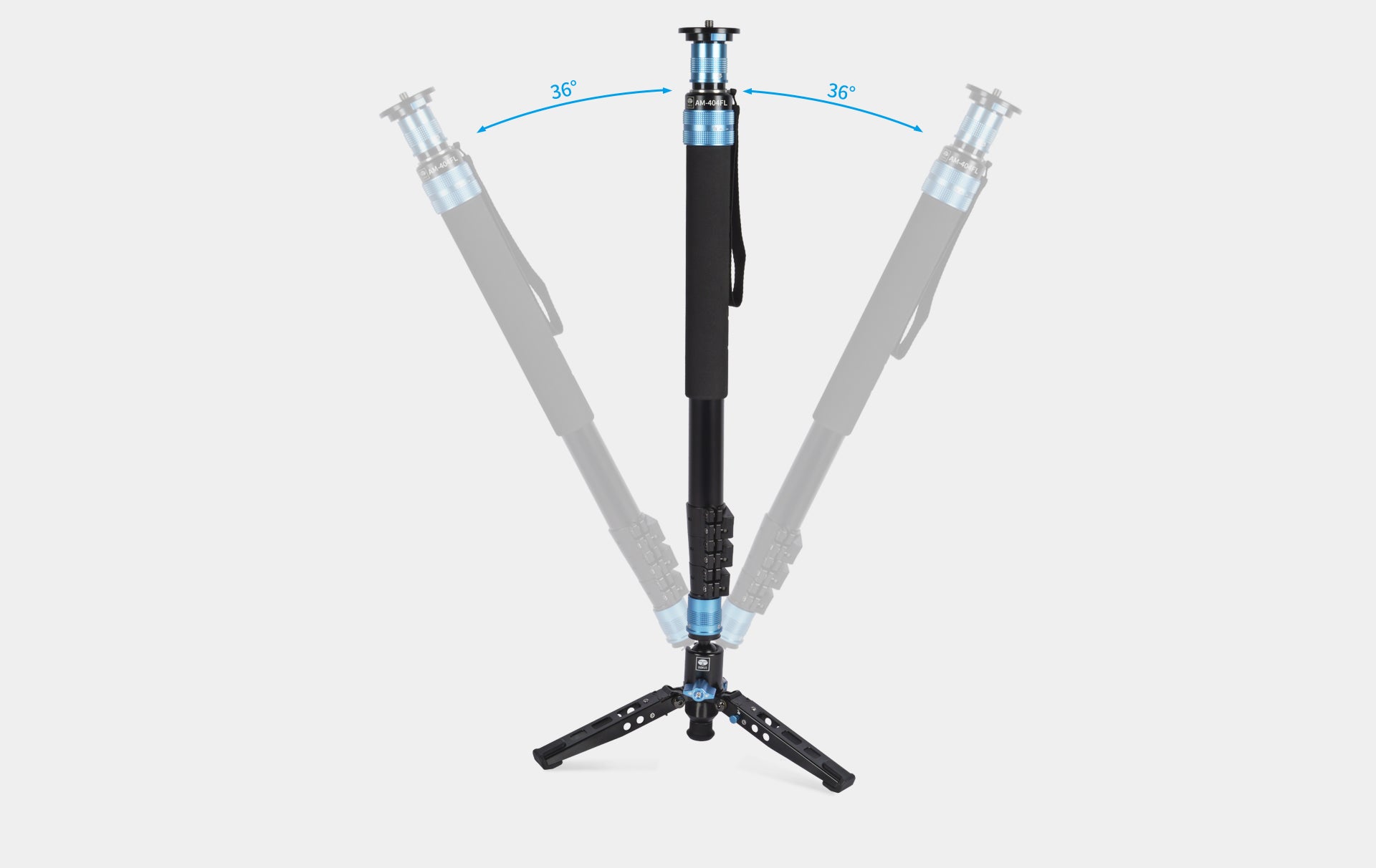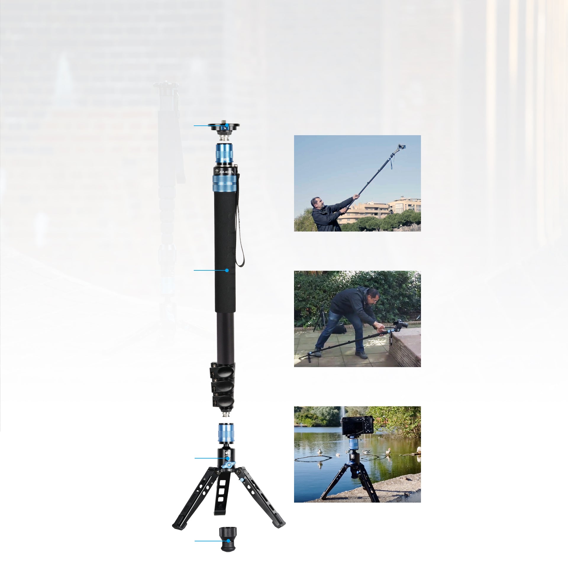The mounting plate, monopod leg and tripod base can be detached and freely combined into a monopod, an extension rod or a tabletop tripod. This is a versatile tool that serves many purposes.