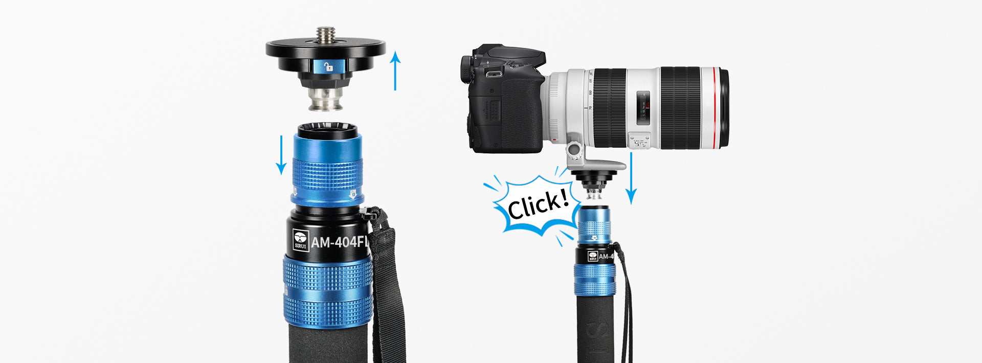 The monopod features a quick-release system. Pull on the sleeve to remove the mounting plate and simply insert the plate back to securely lock it in place.