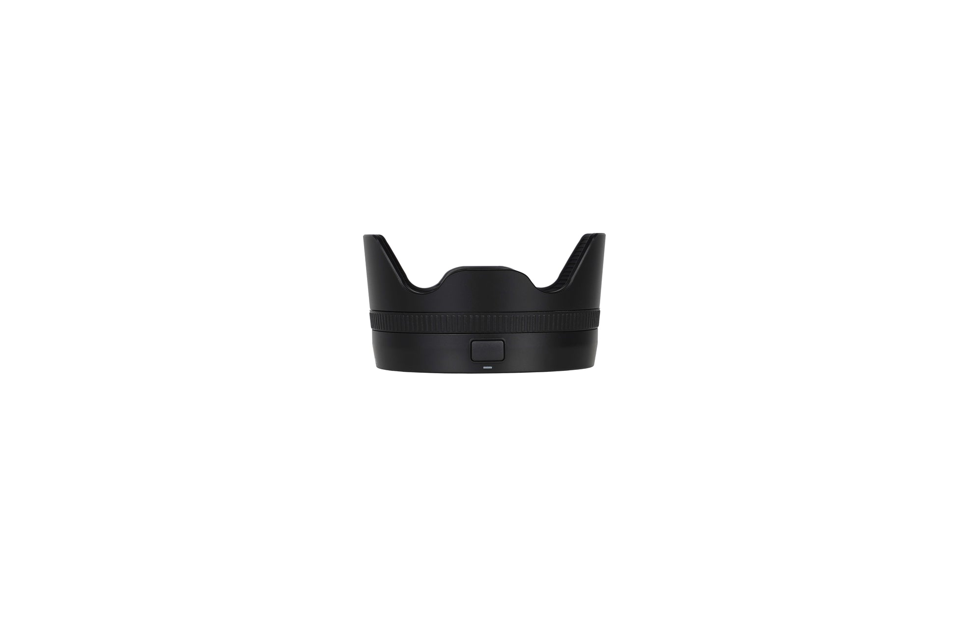 Lens hood with release button for easy removal. It helps reduce stray light and flare.