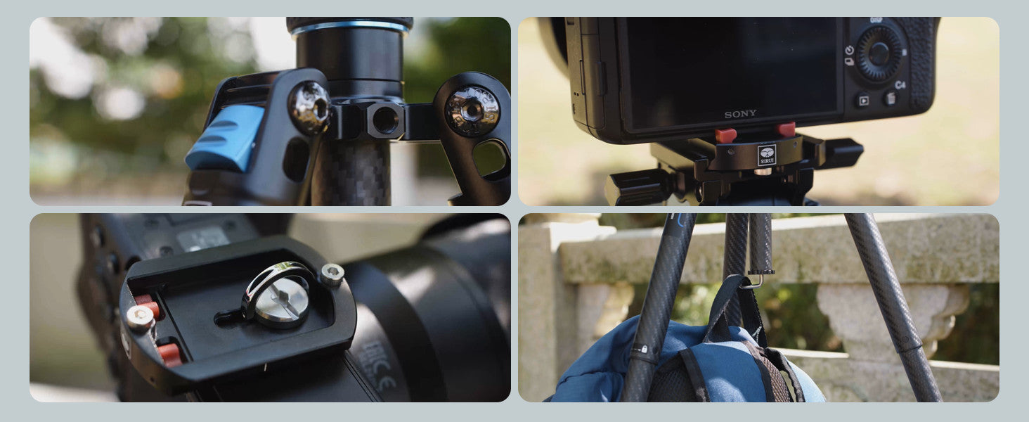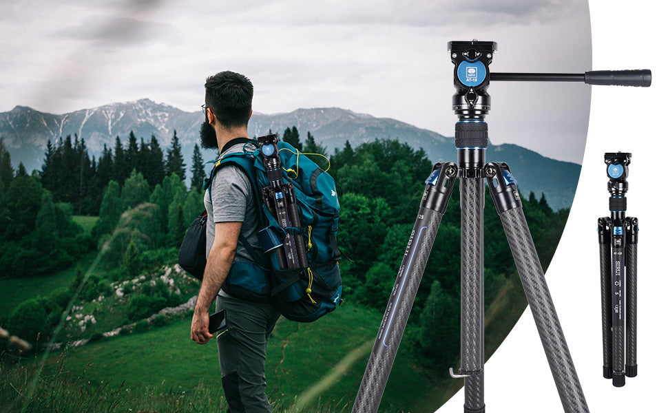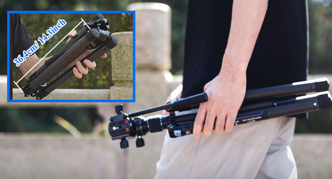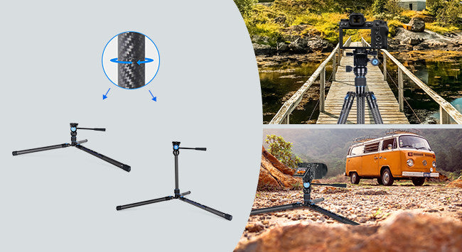 The tripod is considered very lightweight to carry around as the leg and center column are made of pure carbon fiber, and the aluminum parts are hollowed out. Featuring reverse-foldable legs, the pack size is perfectly compact for traveling and backpacking.