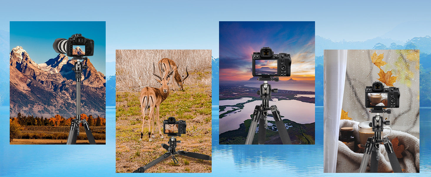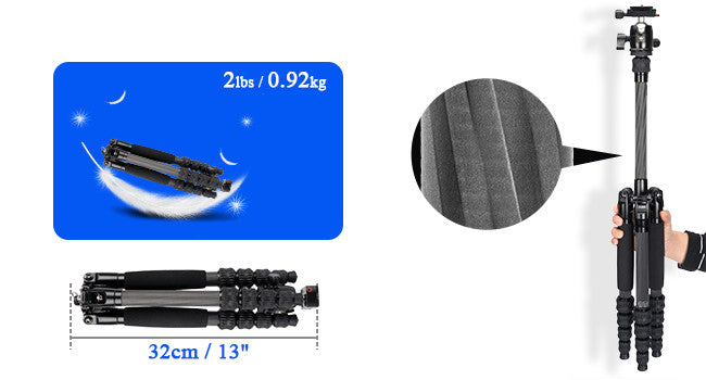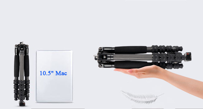 Lightweight but durable, the portable tripod with reverse-foldable legs allows for compact storage size. High-quality carbon fiber construction keeps the weight down while providing excellent sturdiness. It comes with a portable bag, which is easy to carry and pack for travel.